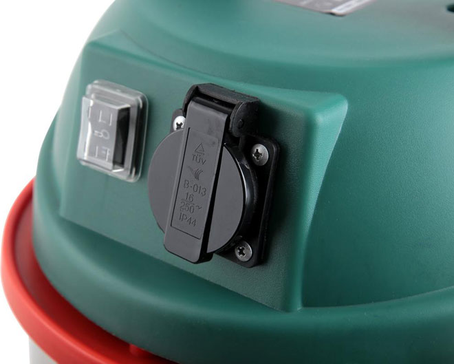 - Розетка для инструментов с функцией синхронного старта. Подключайте циркулярные пилы, фрезеры, рубанки. При включении инструмента автоматически включается пылесос, засасывая пыль и стружку.