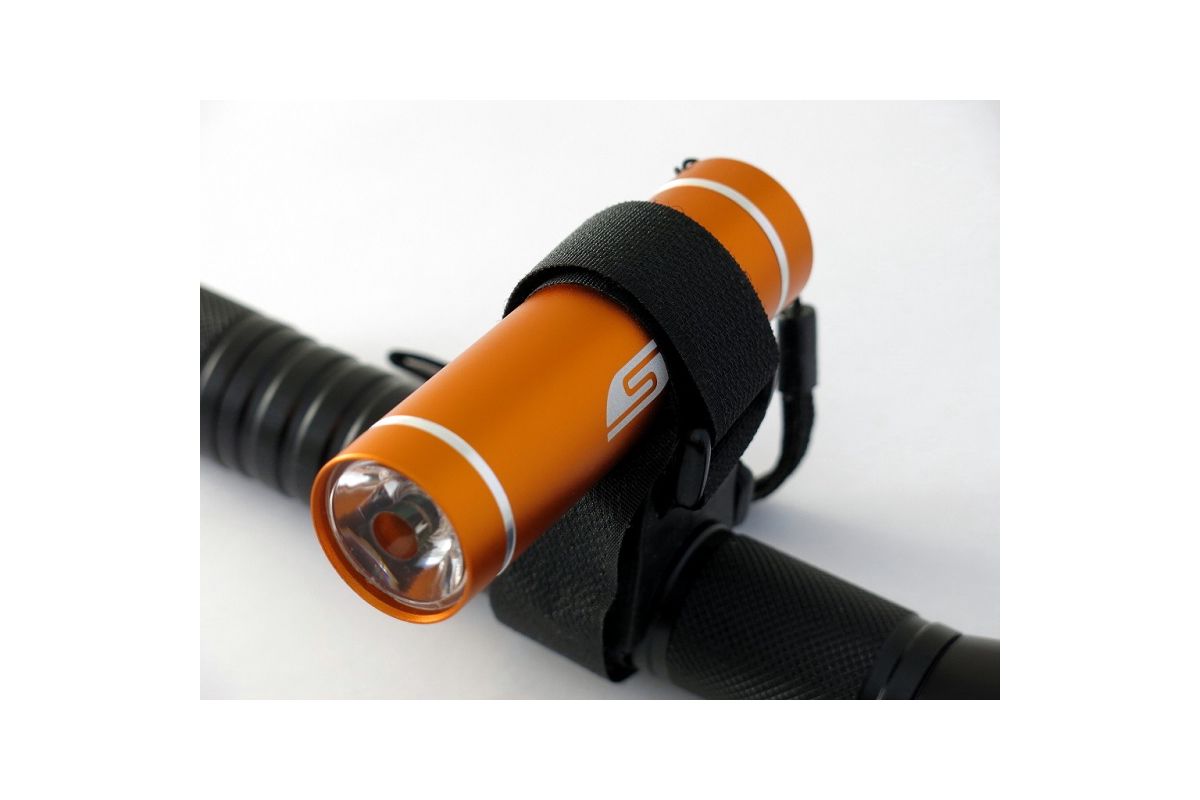 Закрепите фонарь на руле велосипеда при помощи универсального велокрепления. Корпус велокрепления выполнен из плотной резины и снабжён нейлоновыми лентами с липучками и пряжками. Благодаря этому велокрепление подходит практически для любого диаметра руля велосипеда.