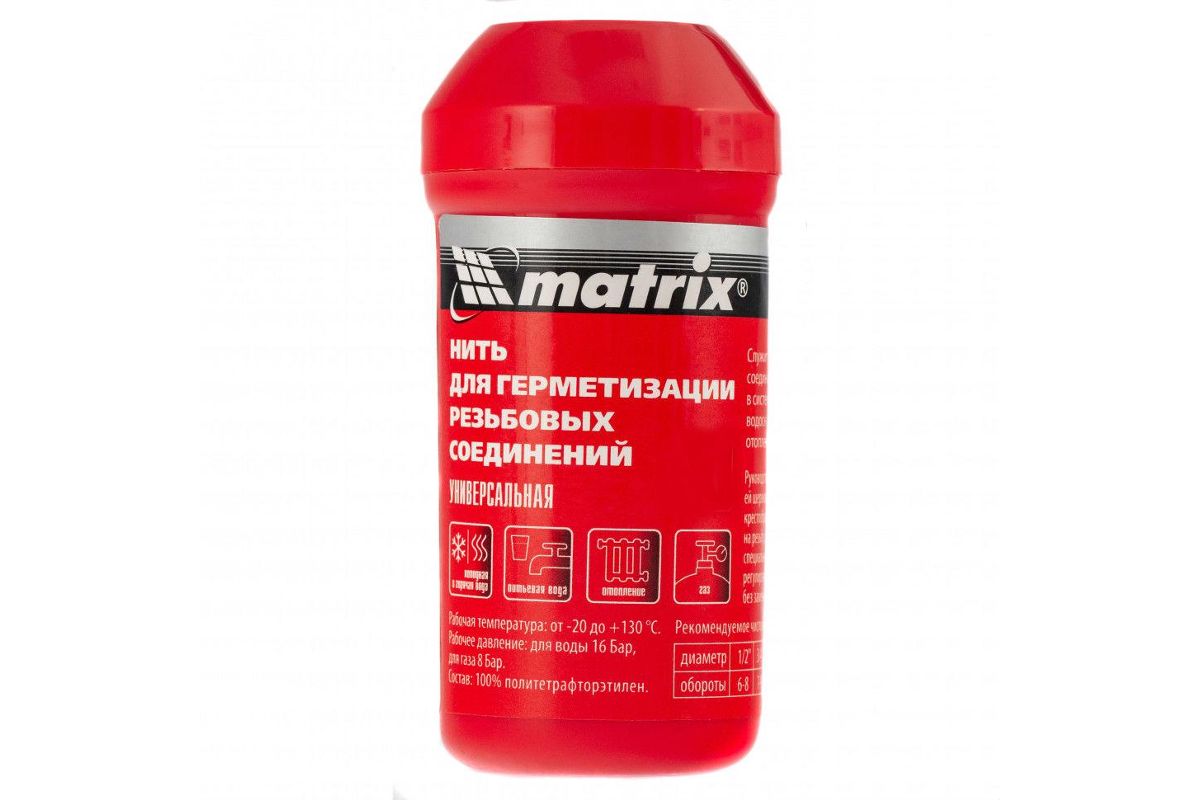 Нить MATRIX 88893 представляет собой универсальный полимерный герметик нового поколения, применяемый для уплотнения всех типов резьбовых соединений как металлических, так и пластиковых труб различного назначения (системы горячего и холодного водоснабжения, питьевой и технической воды, отопления и газоснабжения).